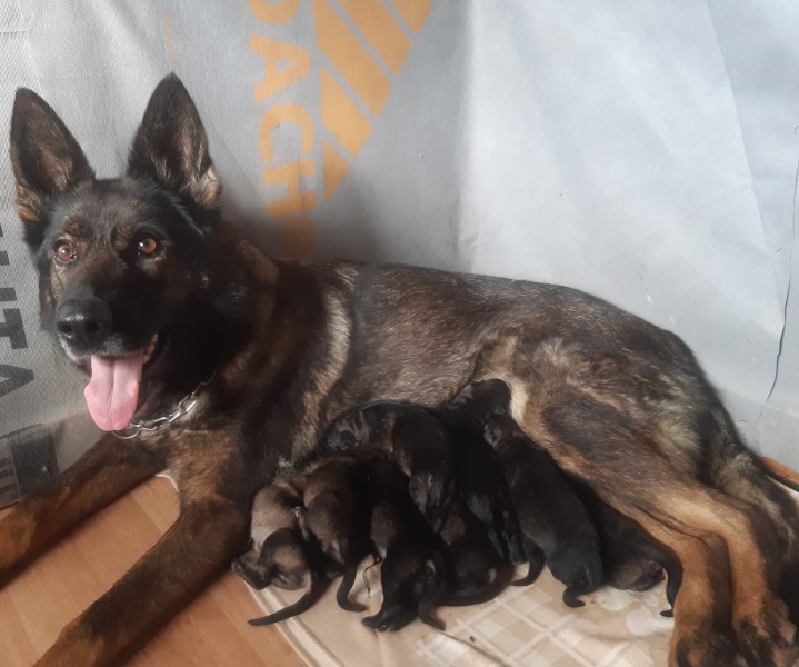 Dne 17.7. 2023 Ajmy porodila 7 psů a 1 fenu, otcem štěňat je vícemistr ČKNO pro letošní rok Chuck Felones